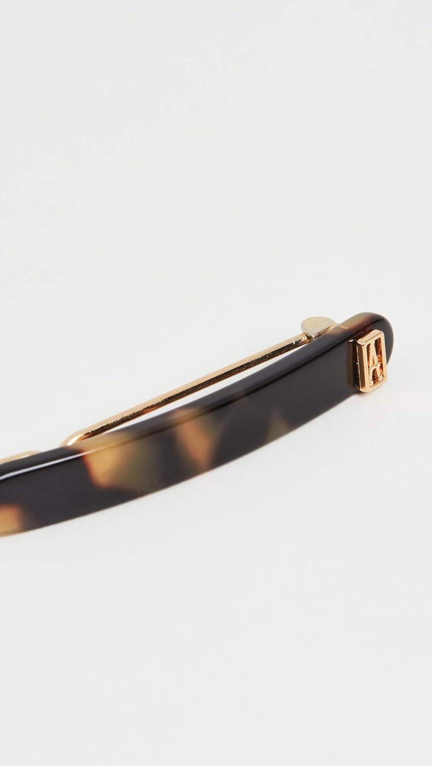 A slim Alexandre de Paris barrette, featuring a glossy tortoiseshell finish and a gold-tone logo emblem.